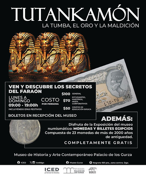 Este abril, Durango se convierte en anfitrión de uno de los eventos culturales más destacados del año: la magna exposición "Tutankamón, la tumba, el oro y la maldición". Esta extraordinaria muestra internacional, albergada en el prestigioso Museo de Historia y Arte Contemporáneo del Palacio de los Gurza, transporta a los visitantes al antiguo Egipto a través de una impresionante colección de más de 200 piezas que recrean fielmente la legendaria tumba del joven faraón.